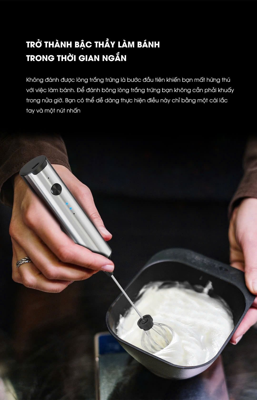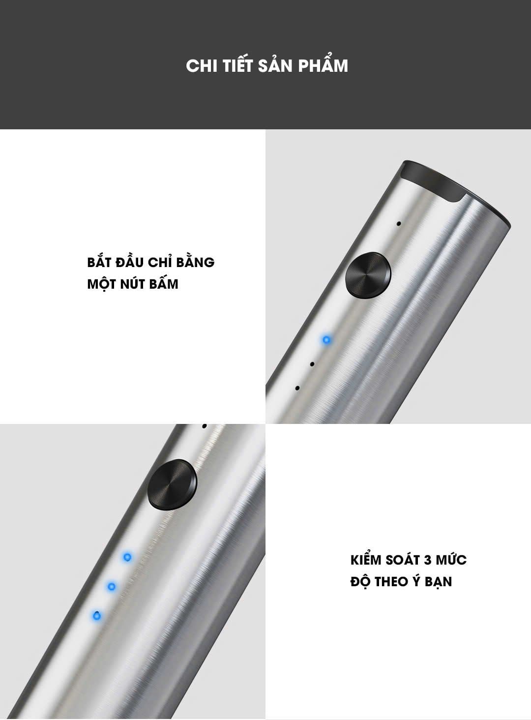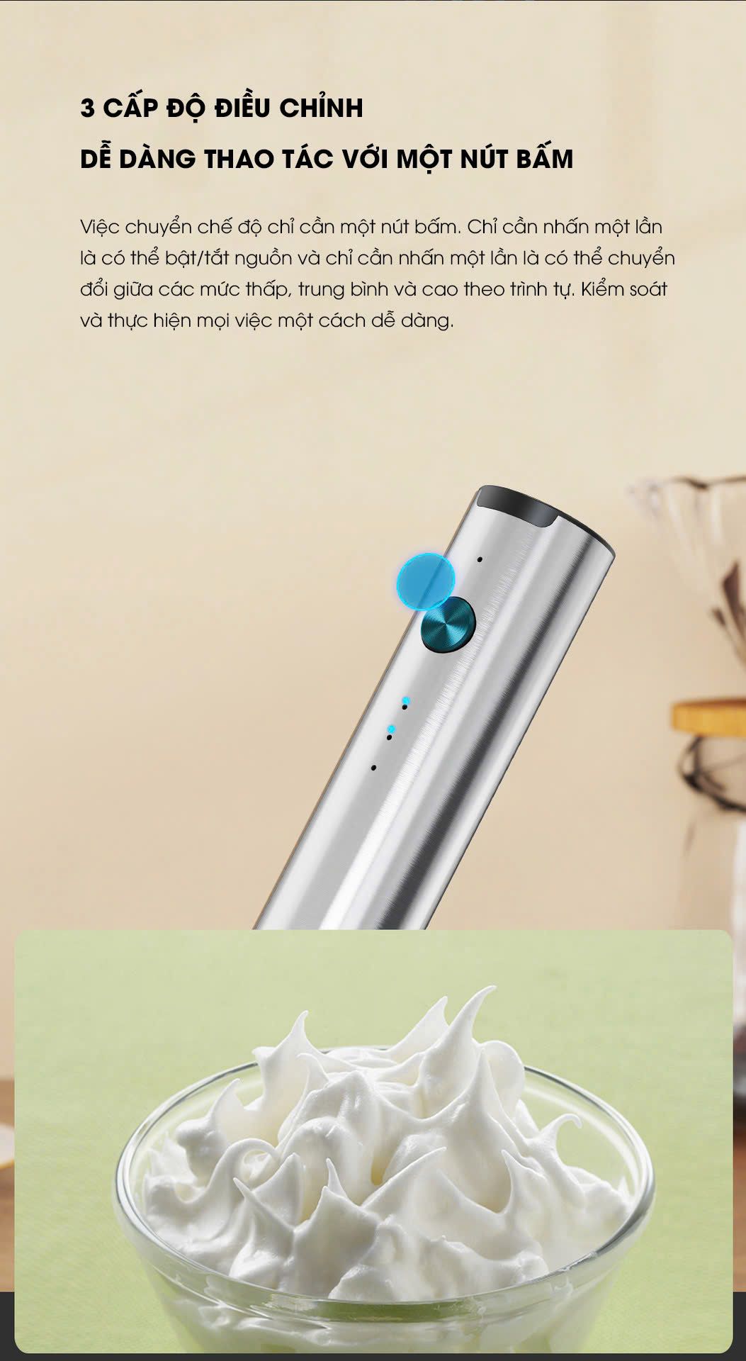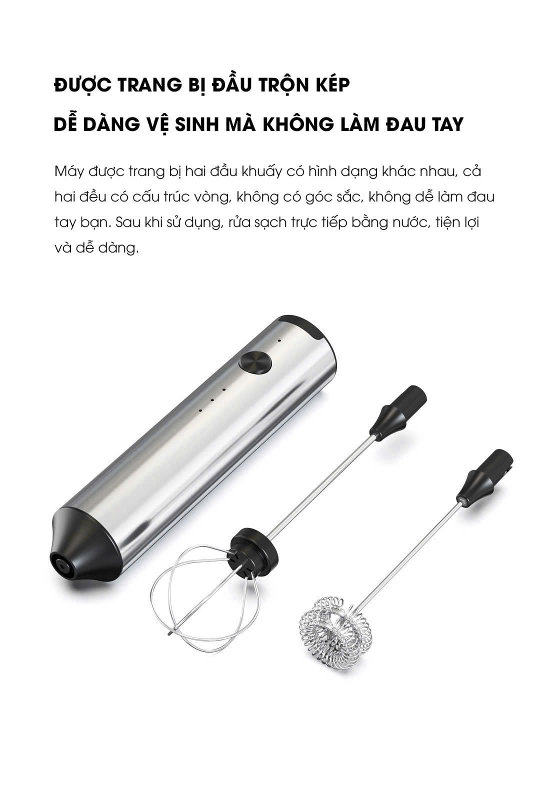 Tốc độ: 3 cấp độ (cao nhất 13.000 vòng/phút) Bộ sản phẩm bao gồm: 1 thân máy, 1 đầu tạo bọt, 1 đầu đánh trứng, 1 đế sạc, 1 cáp sạc USB-C