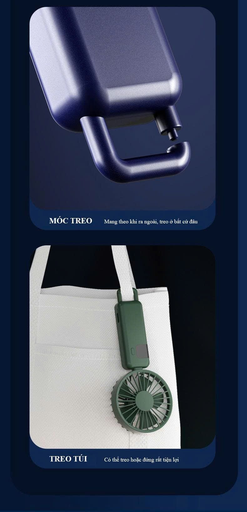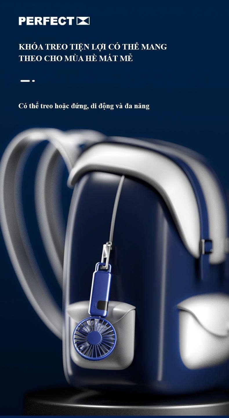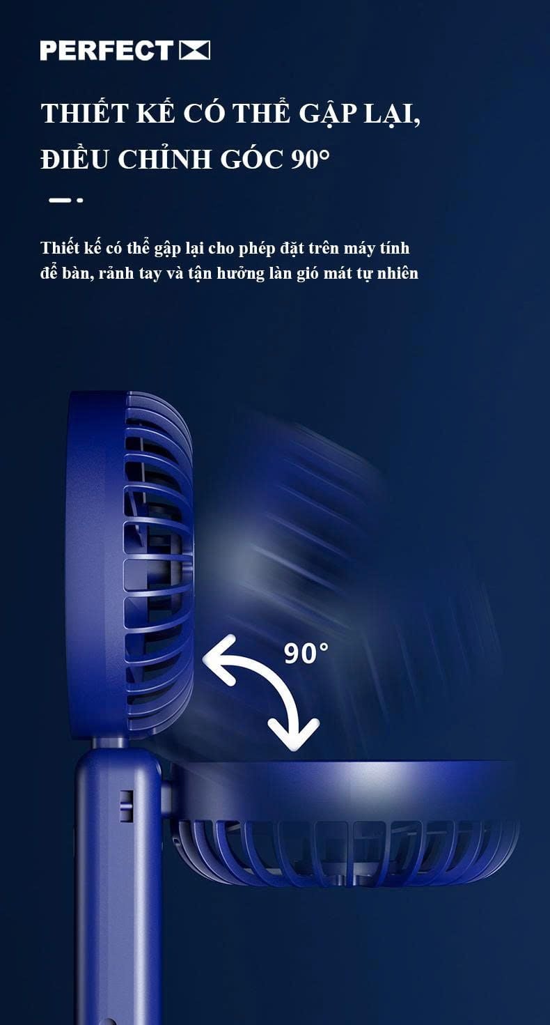 - Thiết kế cầm tay thông minh, có thể gấp gọn 90 độ, vừa thành quạt để bàn, quạt đeo cổ thông minh